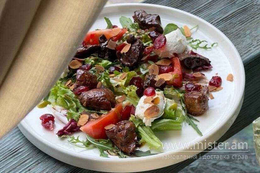 Мікс салату, томати, в`ялена журавлина, вершковий сир, гранатовий соус.
