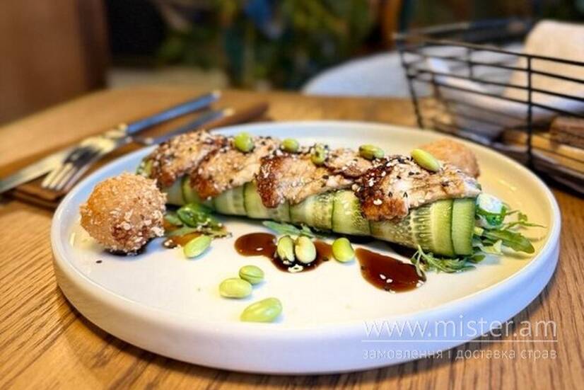 Салатний рол з копченим вугрем, водоростями хіяші, міксом салату