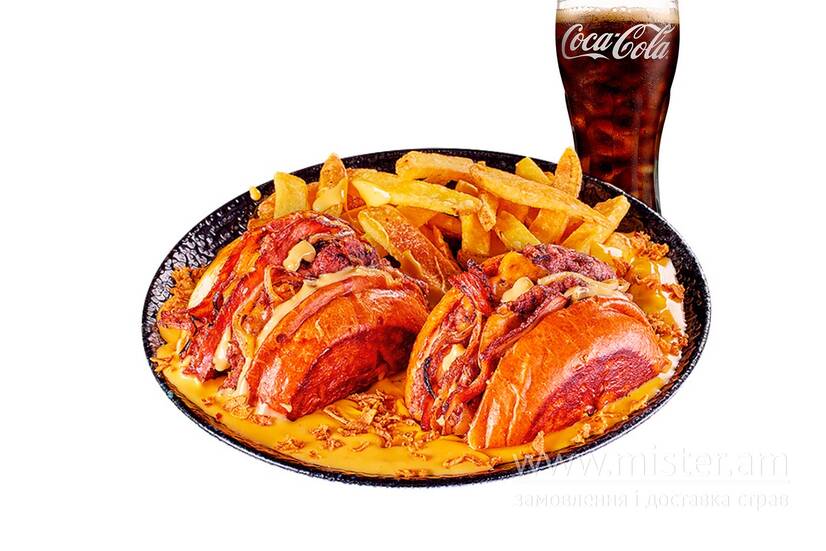 Екстра чізбургер, картопля фрі, кетчуп, Кока-кола.