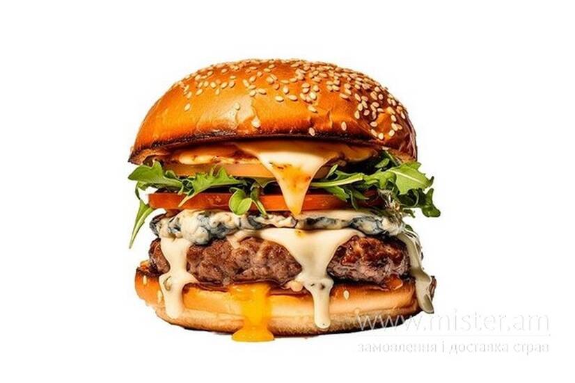 Котлета з телятини, мікс салатів, помідори свіжі, сир чедер, сир моцарела,сир дор-блю, сир пармезан, соус.