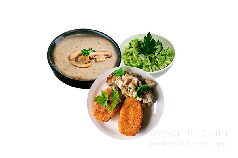 Грибний крем-суп, котлетки зі свинини з картоплею, салат з капусти.