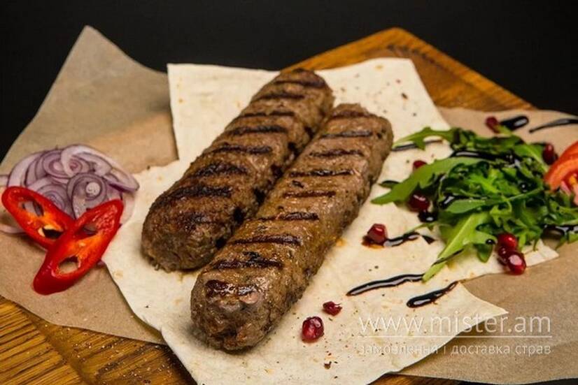 Фарш з яловичини, цибуля, кінза, соус BBQ, лаваш.