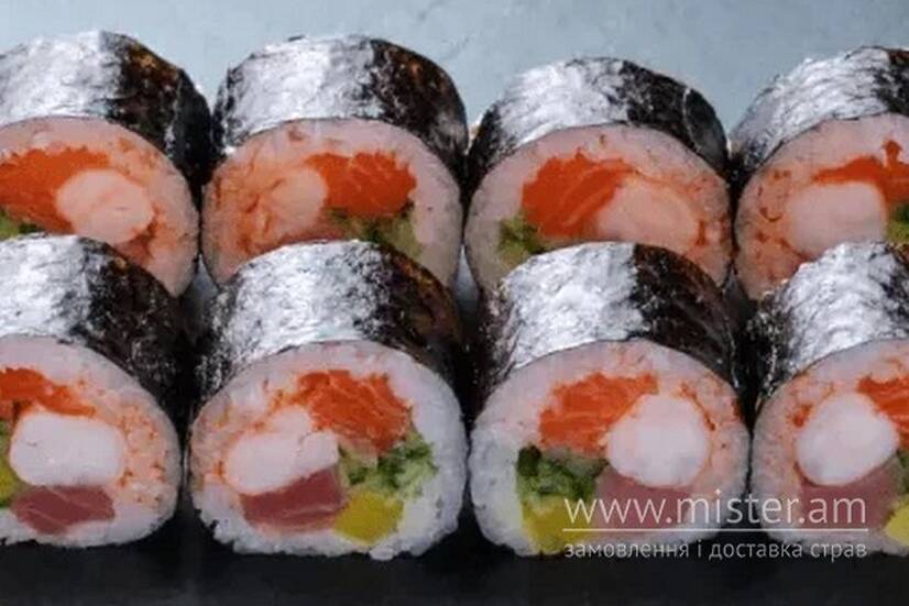 Рис, лосось, креветка, тунець, огірок, такуан, соус кімчі.