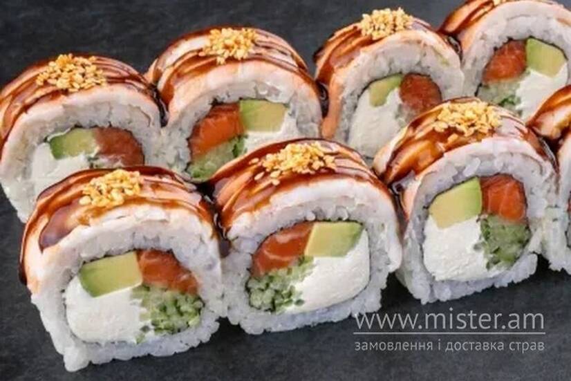 Рис, норі, сир Філа, лосось, креветка, авокадо, огірок, соус унагі.