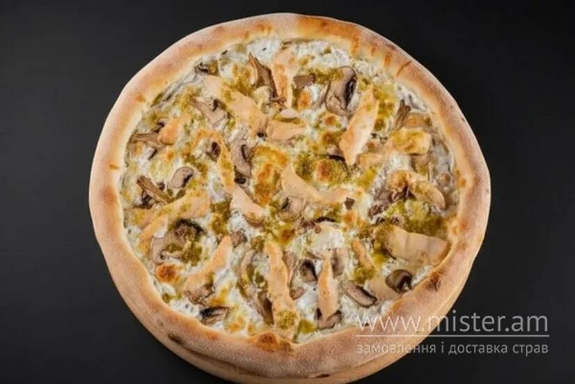 Тісто, вершки, грибний соус, курка, моцарела, твердий сир, зелень.