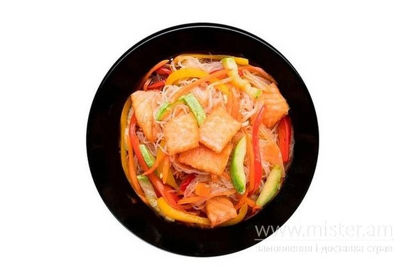 Локшина, фунчоза, лосось, тунець, кунжут, цибуля, морква, болгарський перець, гриби.