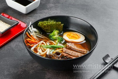 Локшина Удон, телятина, яйце куряче, норі, вакаме, перець болгарський, морква, спаржа, броколі, селера.