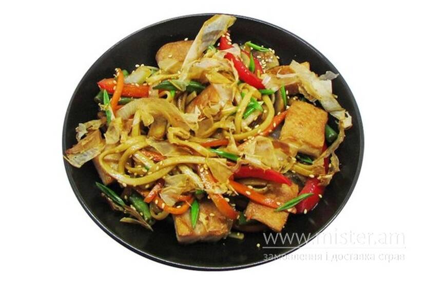 Локшина удон, тунець, кунжут, цибуля, морква, болгарський перець, гриби.
