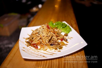 Локшина удон, куряче філе, кунжут, цибуля, морква, болгарський перець, гриби.
