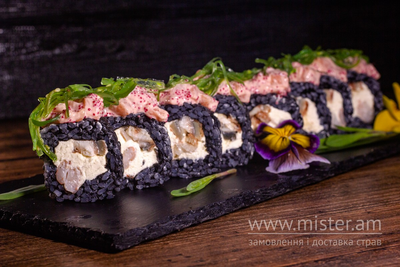 Рис, чорнила каракатиці, норі, крем-сир, вугор, лосось, тигрова креветка, соус спайсі, ікра масаго,хіяші.