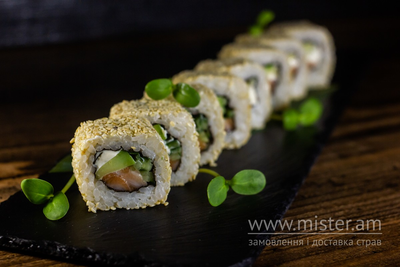 Рис,норі, вугор, огірок, авокадо, японський майонез, кунжут.