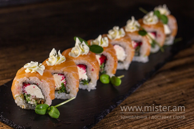 Рис, норі, лосось, вугор, крем-сир, хіяші, ікра масаго.