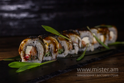Рис, норі, вугор, крем-сир, лосось, авокадо, унагі соус, чорний кунжут.