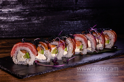 Рис, норі, тунець, крем-сир, ікра тобіко, лосось, авокадо, соус унагі.