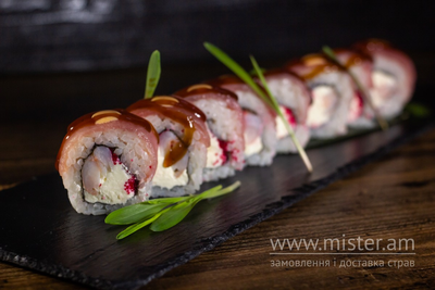 Рис, норі, тунець, крем-сир,креветка тигрова,ікра масаго, спайсі соус, унагі соус.