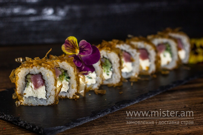 Рис, норі, тунець, огірок, крем-сир, стружка тунця.
