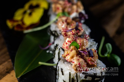 Рис, норі, вугор, крем-сир, спайсі соус, ікра масаго.