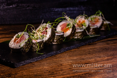 Рис, норі, тунець, лосось, креветка темпура, сніжний краб, огірок.