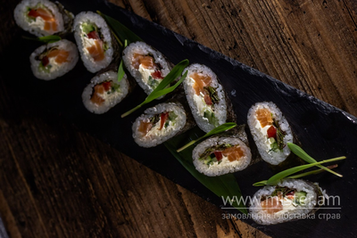 Рис, норі, лосось, крем-сир, перець болгарський, огірок, листя салату.