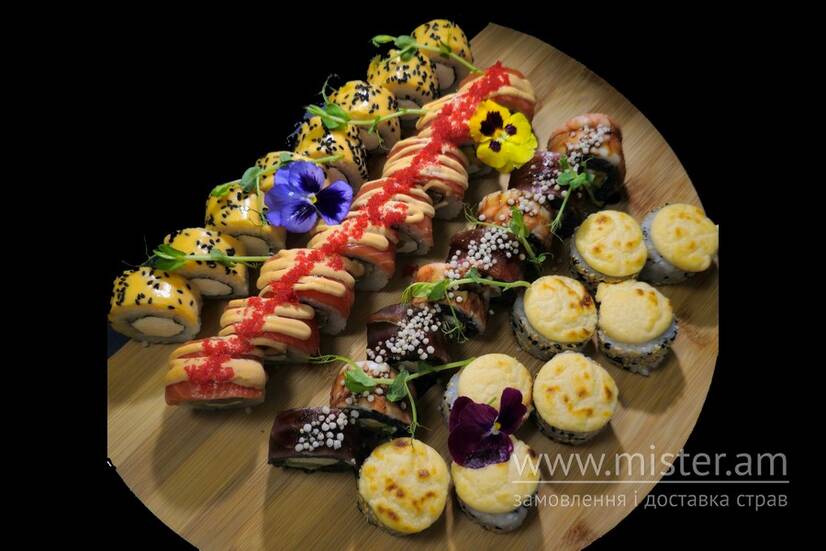 Рол чорний мікс з креветками та тунцем, Запечений зі смаженим лососем, Сирний з кунжутом, Спайсі з лососем.
