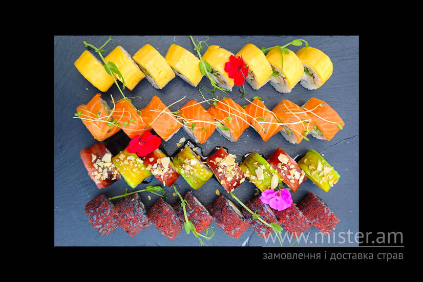 Філадельфія з лососем, Блек краб, Сирний з куркою, Райдужний рол з тунцем та креветкою.