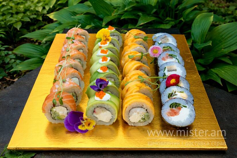 Філадельфія 50/50 (рис, норі, крем сир, лосось, креветка, огірок, авокадо), Сніжний авокадо (рис, норі, крем сир, сніжний краб, авокадо, червона ікра), Сирний з креветками (рис, норі, крем сир, огірок, креветка, тостовий сир, унагі соус), Кісу макі (рис, норі, крем сир, лосось, зелений лук, японський омлет).