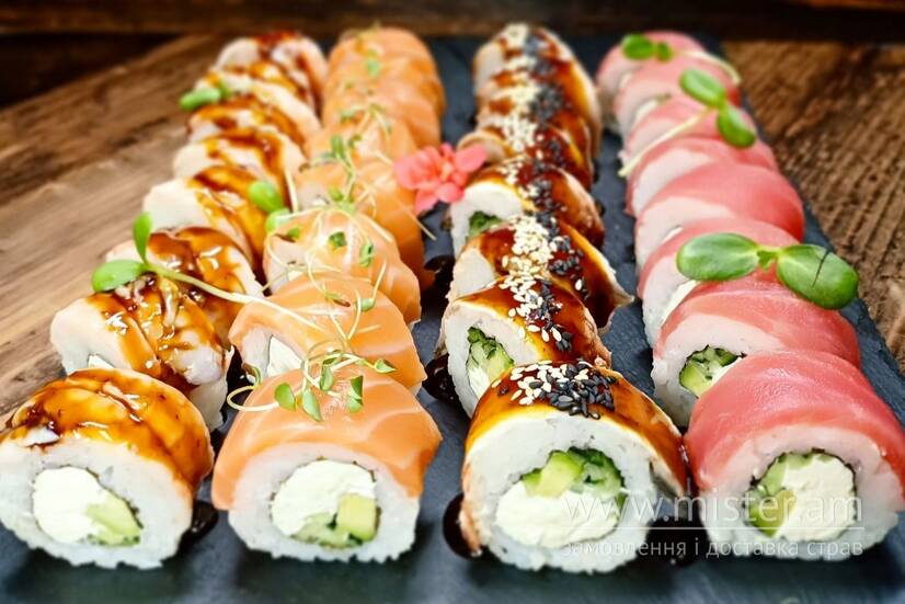 Філадельфія з лососем, Філадельфія з креветками, Філадельфія з тунцем, Філадельфія з вугрем.