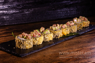 Рис, норі, тунець, ікра тобіко, авокадо, листя салату, вершковий сир, сухарі.
