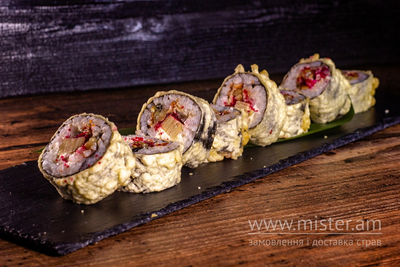 Рис, норі, вугор, крем-сир, японський омлет, ікра масаго, соус унагі, сухарі.