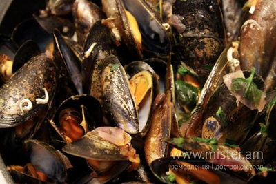 Дві дюжини чілійський мідій у мушлях у винному соусі