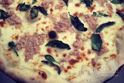 Піца з цибулею, тунцем, шпинатом і моцарелою