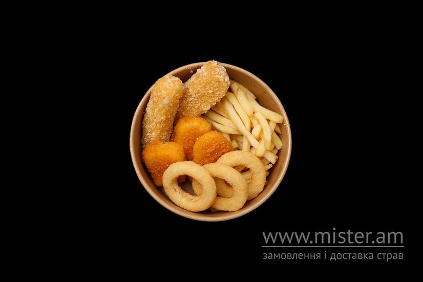 Картопля фрі, нагетси, цибулеві кільця та сирні палички в паніровці.