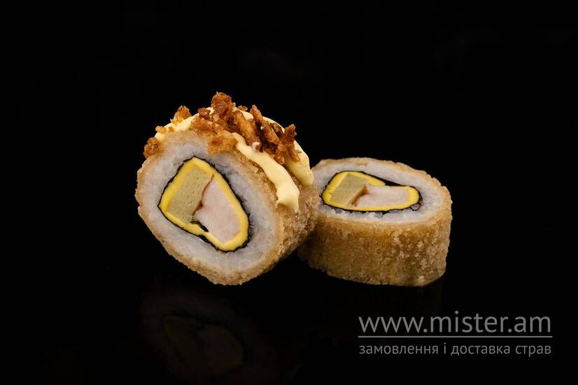 Суші-рис, норі, курка копчена, японський омлет, листовий сир, цибуля порей, соус чеддер, цибуля фрі. 8 шм.