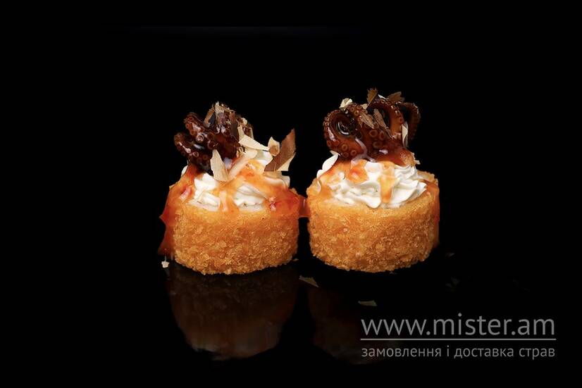 Суші-рис, норі, восьминіг, вершковий крем сир, огірки, соус солодкий чілі, стружка тунця. 8 шм.