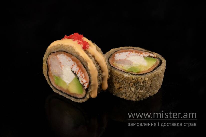 Норі, авокадо, лосось, крабові палички, креветки тигрові, вершковий крем-сир, цибуля порей, соус спайс, ікра тобіко. 8 шм.