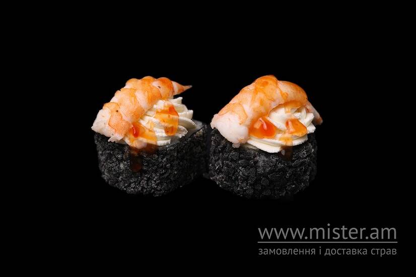 Суші-рис, норі, креветки тигрові, вершковий крем сир, огірки, айсберг, соус солодкий чілі. 8 шм.