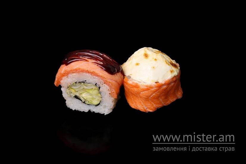 Суші-рис, норі, лосось, айсберг, цибуля порей, соус унагі, сирний соус. 8 шм.