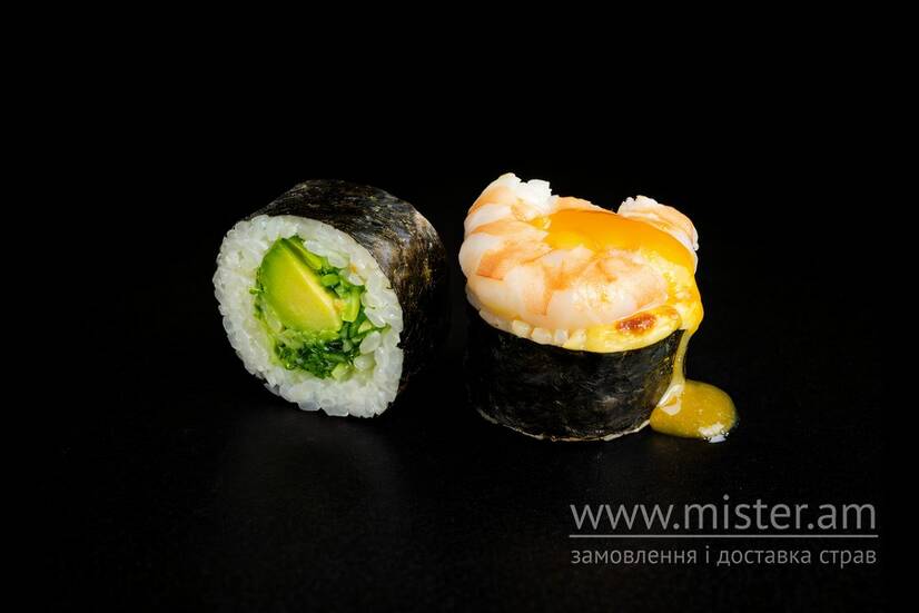 Суші-рис, норі, креветки тигрові, авокадо, огірок, сирний соус, соус манго. 8 шм.