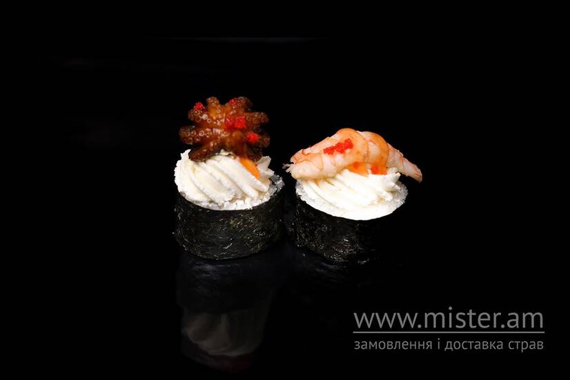 Суші-рис, норі, вершковий крем-сир, японський омлет, огірки, тигрові креветки, восьминіг, ікра тобіко, соус солодкий чілі. 8 шм.
