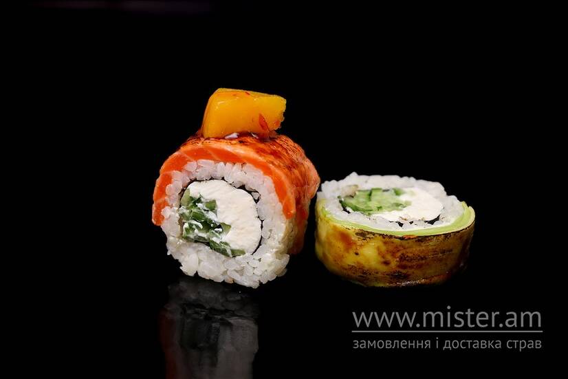 Суші-рис, норі, лосось, авокадо, вершковий крем-сир, огірок, соус унагі, персики. 8 шм.