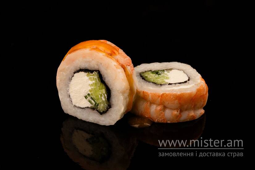 Суші-рис, норі, тигрові креветки, вершковий крем-сир, огірок, соус манго. 8 шм.