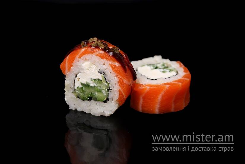 Суші-рис, норі, копчений лосось, вершковий крем-сир, огірок, унагі з каперсами. 8 шм.