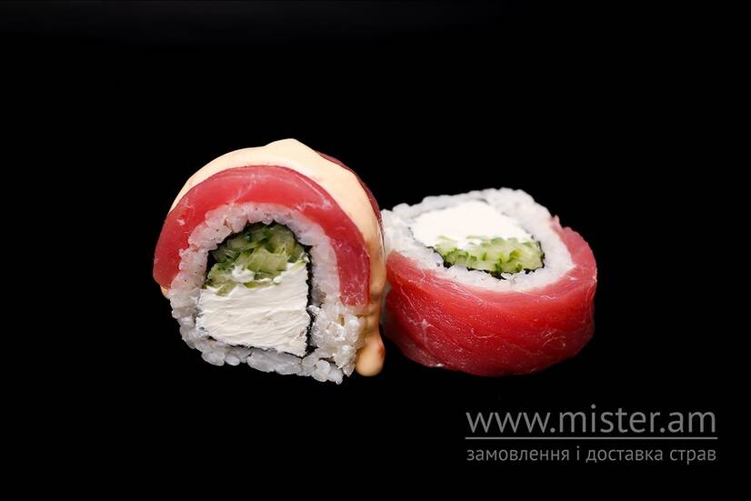 Суші-рис, норі, тунець, вершковий крем-сир, огірок, соус горіховий. 8 шм.