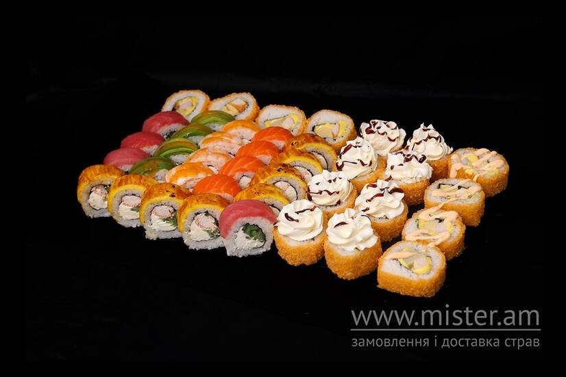 Філадельфія з лососем ½ , Філадельфія з креветками ½,чіз рол з крабом, Філадельфія мікс,теплий рол з мідіями,теплий чіккен рол. 48 шм.