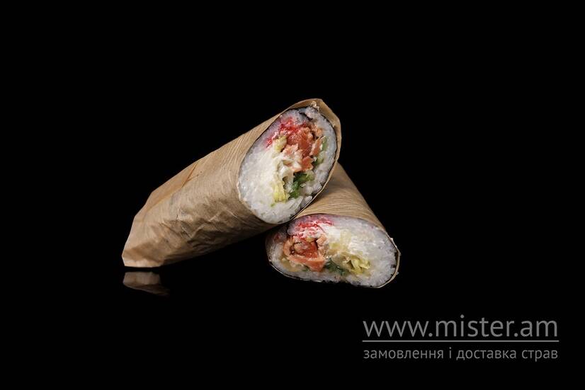 Суші-рис, норі, вершковий крем-сир, огірок, лосось смажений в унагі, айсберг, соус солодкий чілі, ікра тобіко.
