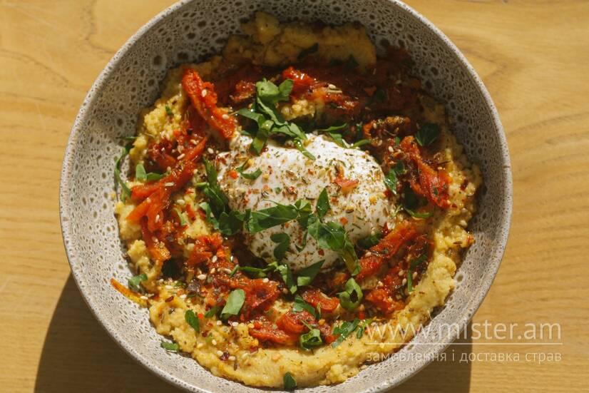 Хумус, яйце пашот, в`ялені томати, заатар з кунжутом та пластівцями чилі, кінза, хліб на заквасці.