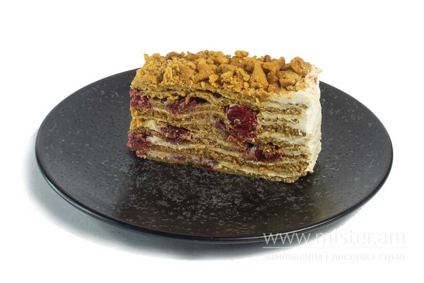 Поєднання ароматних медових коржів, ніжного сметанного крему та карамелізованої вишні.