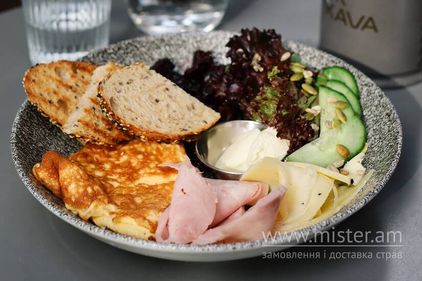 Омлет на сметані, шинка, сир Гауда, печений буряк, мікс листя салату, огірок, вершкове масло, насіння гарбуза та соняшника, хліб на заквасці.