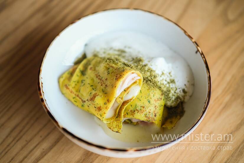 Млинці, шинка куряча, сир Моцарела, сметана, клітковина з гарбуза.