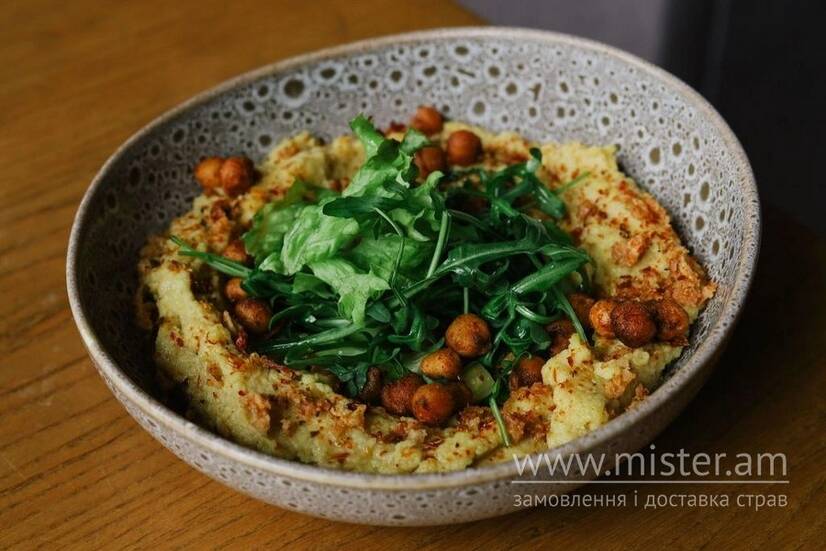 Хумус, мікс листя салату, огірок, смажений нут у паніровці, хрустка смажена цибуля, клітковина конопель, пелюстки паприки, оливкова олія, хліб на заквасці.
